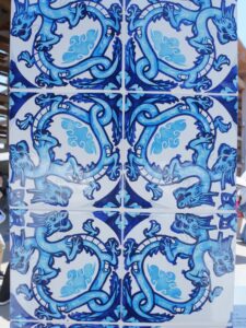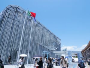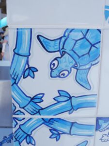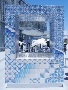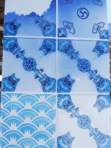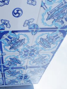 アズレージョ 2025.08.06 イベント 晴天に映える青いタイル アズレージョ ポルトガル文化を象徴するもので、万博会場のポルトガルパビリオンの 入り口付近にフォトスポットとして展示されていました。 緻密にデザインされたタイルが素敵だなぁと思い 近づいて1枚1枚のタイルの柄をよく見てみると...! 亀や龍、タヌキや鬼瓦などが描かれてて、遠くから見た異国情緒あふれる さわやかな印象とは異なる、和の要素がたくさん取り入れられた おもしろいデザインで、とても興味深く見入ってしまいました✨