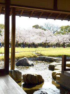 ちょうど桜が見頃で、広い庭園のあちこちに